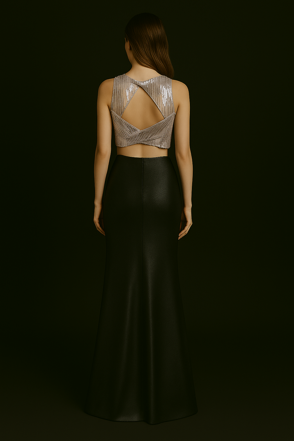 | Conjunto de dos piezas compuesto por un top y una falda. El top es de corte recto, sin mangas, con escote cerrado y largo hasta la línea de la cintura. Está elaborado en tela de lentejuelas con textura vertical. La falda es de tiro alto, con silueta ajustada en la cadera y caída en línea sirena. |