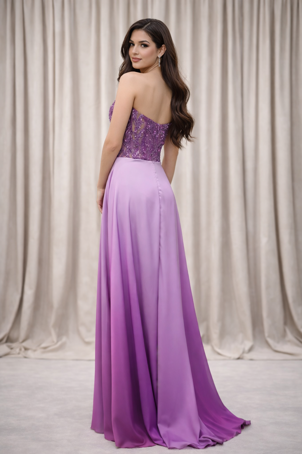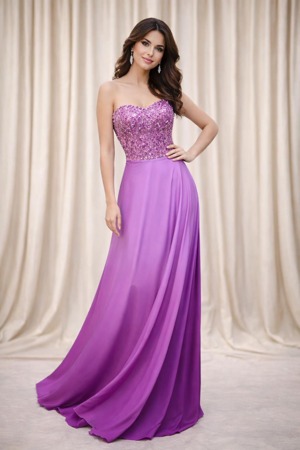 Vestido silueta línea A de largo al piso, escote semi corazón, cuerpo ajustado con conformación al busto y desarrollo estructurado hasta la cintura, talle definido mediante corte horizontal, falda con amplitud progresiva desde la cintura y caída fluida hasta el ruedo