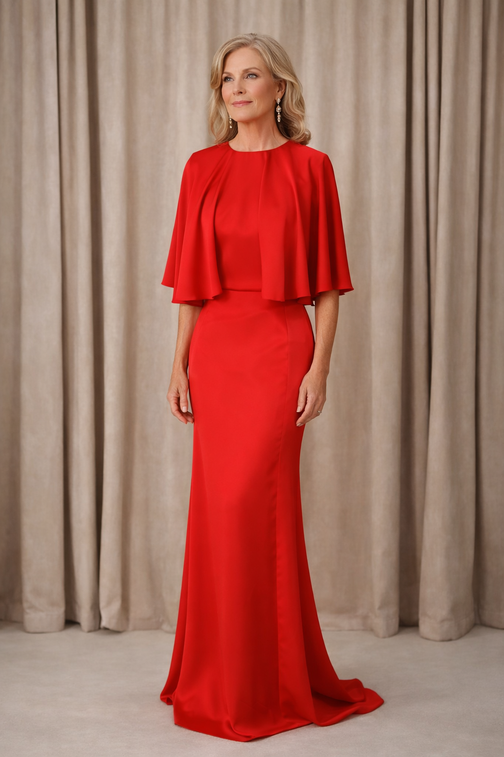Vestido silueta entallada desde torso hasta cadera con ampliación inferior desde rodilla hasta piso. Escote cerrado. Cuerpo ajustado en busto y cintura con capa superior que cubre hombros y parte superior del torso. Corte en cintura. Falda ajustada en cadera con extensión hasta piso y leve prolongación posterior.