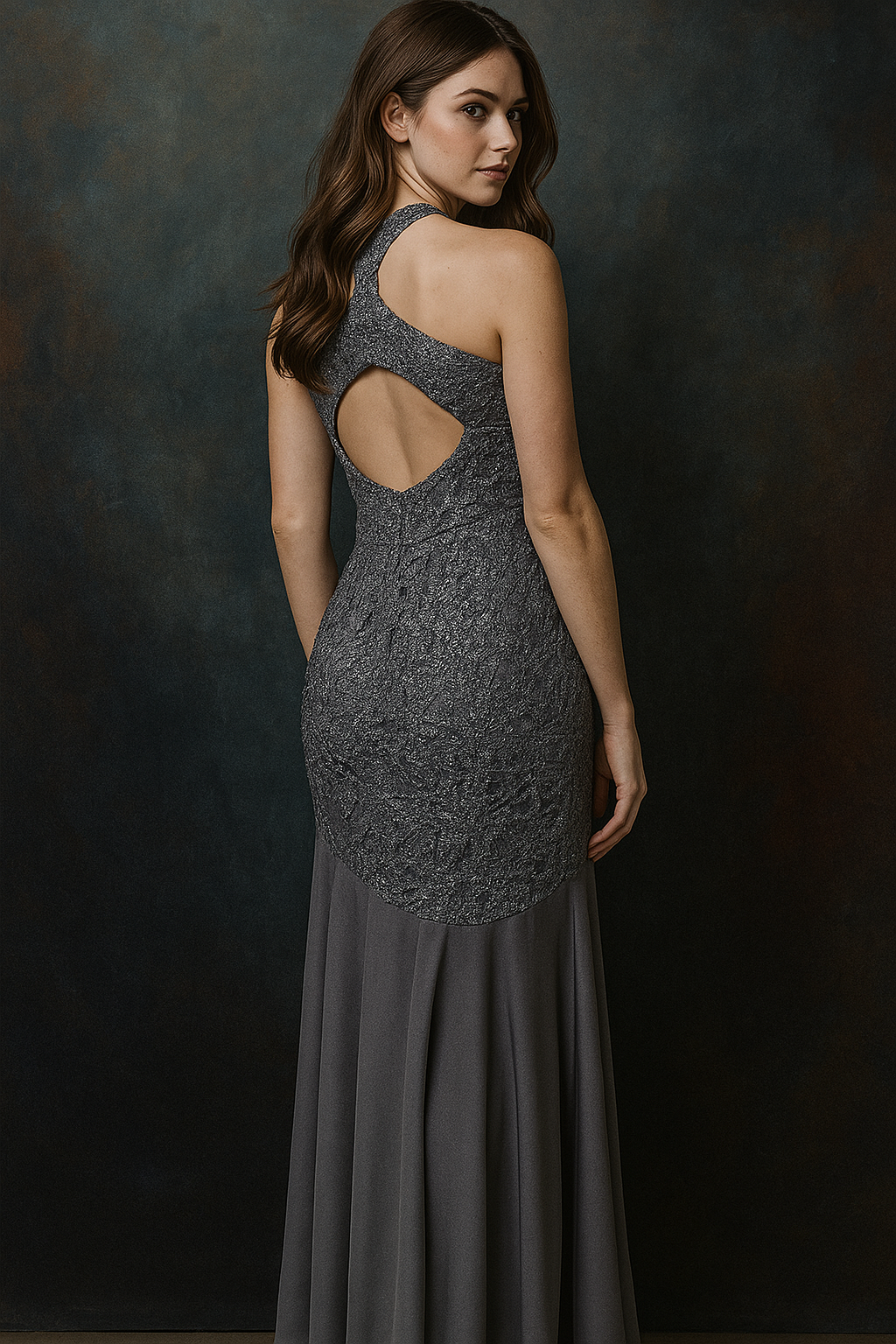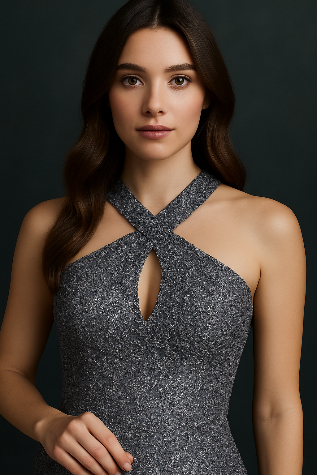 Vestido largo de una pieza en tono metálico con acabado brillante. El escote es alto con detalle cruzado en el frente que forma una abertura en forma de lágrima sobre el pecho. Los tirantes son delgados y se extienden hacia los hombros. La parte superior es ajustada al cuerpo hasta la cadera, y la falda se abre con un corte tipo sirena desde la parte baja de la cadera, con amplitud hacia el ruedo.