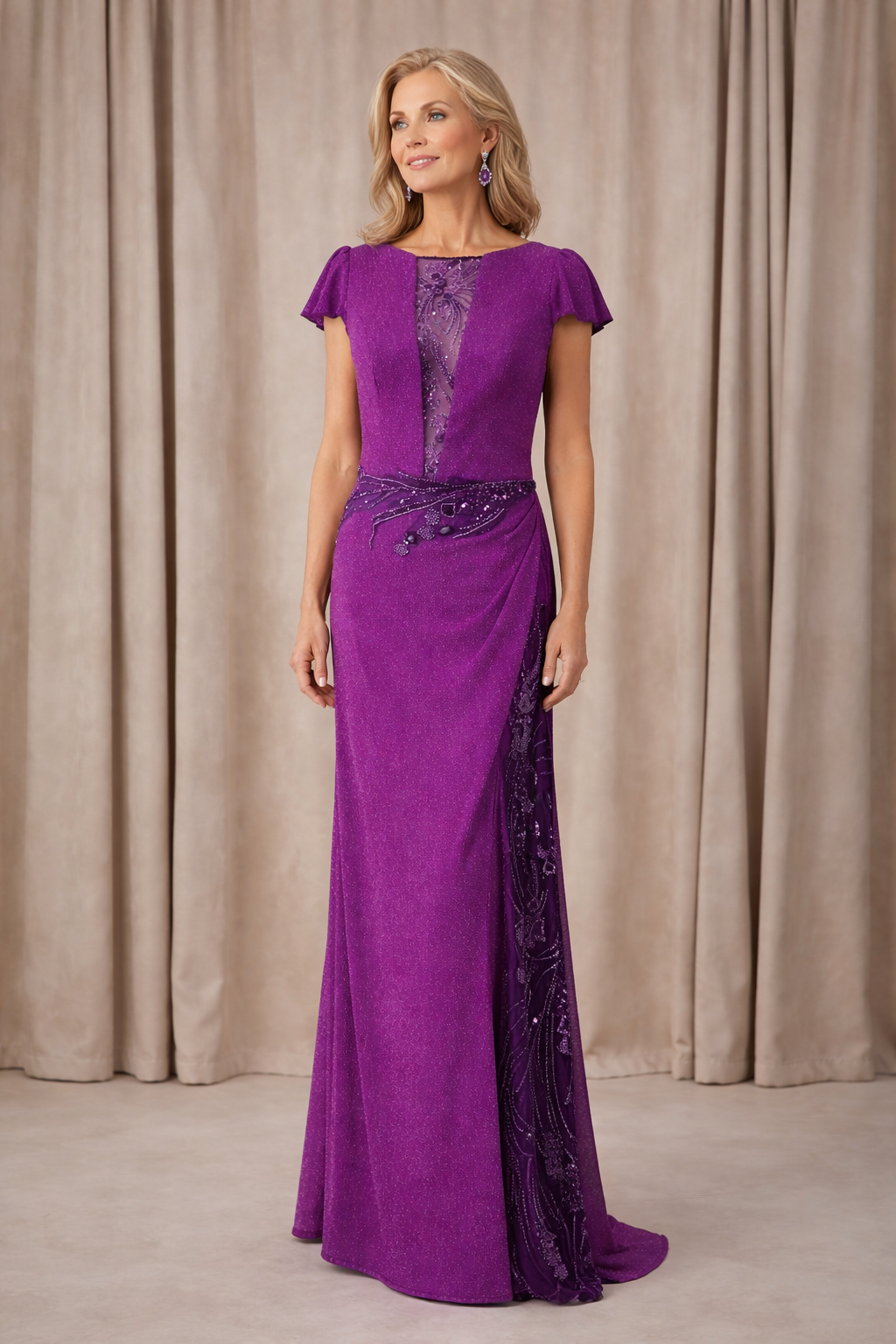 Vestido silueta entallada desde torso hasta cadera con línea recta hacia el borde inferior. Escote cerrado con abertura central vertical con aplicación de encaje en busto. Mangas cortas sobre hombros. Cuerpo ajustado en busto y cintura. Corte en cintura con drapeado lateral y aplicación de encaje en panel lateral de falda.