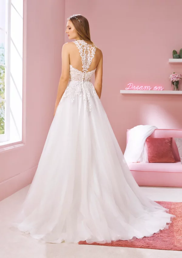VESTIDO CON CUERPO ILUSION SOBRE UN LINDO ESCOTE CORAZÓN MANGA SISA FALDA EN TULL CON APLIQUES EN CAIDA